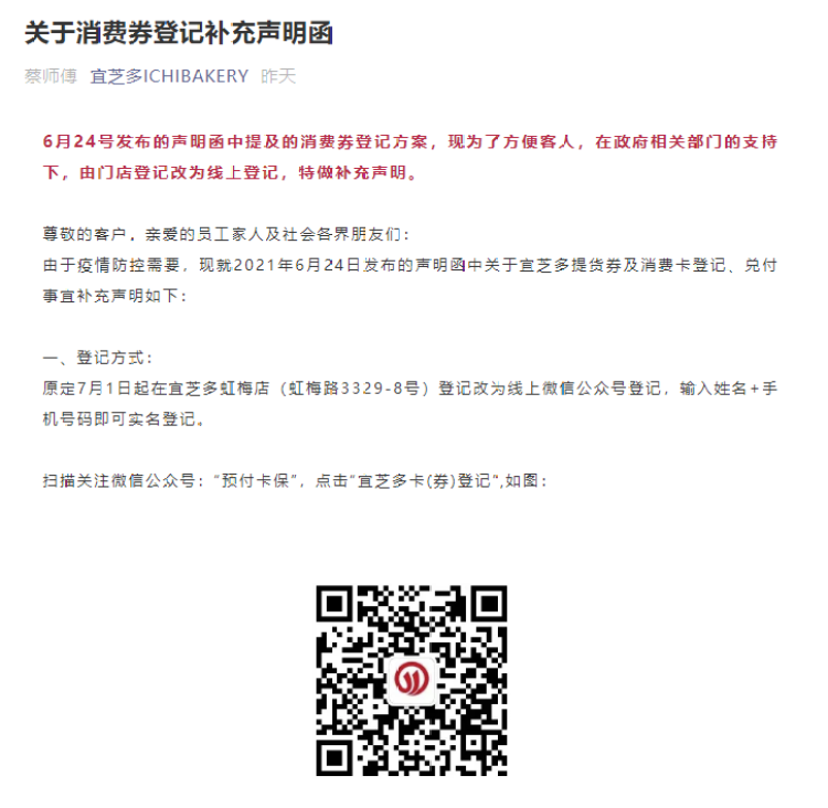 Jun 29, 2021 · 6月28日晚间,宜芝多发布了"关于消费券登记补充声明函"。该补充声明函称:6月24号发布的声明函中提及的消费券登记方案,现为了方便客人,在政府相关部门的支持下,由门店登记改为线上登记,特做补充声明。